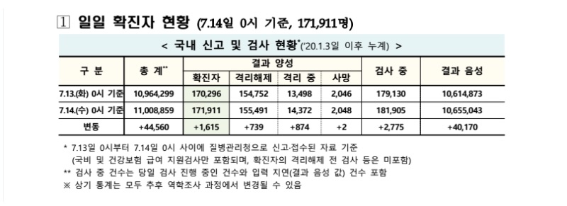 코로나19 국내 확진환자 총 171911명 및 격리해제 155491명·사망 2048명, 7월 14일 0시 기준 1615명 추가 확인