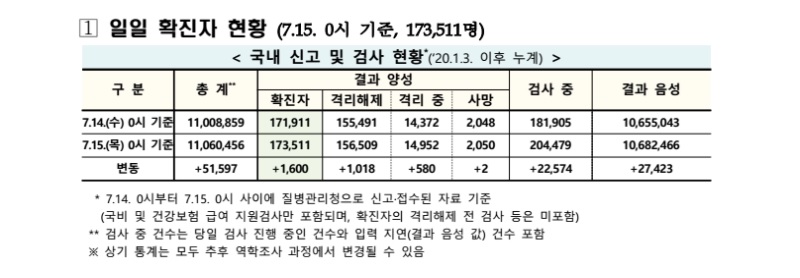 보건·의료 | 코로나19 국내 확진환자 총 173511명 및 격리해제 156509명·사망 2050명, 7월 15일 0시 기준 1600명 추가 확인