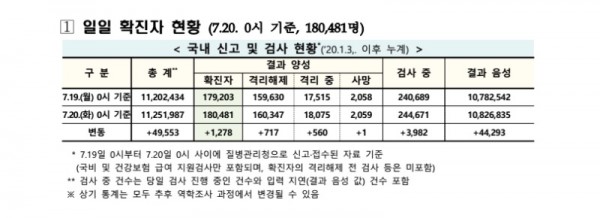보건·의료 | 코로나19 국내 확진환자 총 180481명 및 격리해제 160347명·사망 2059명, 7월 20일 0시 기준 1278명 추가 확인
