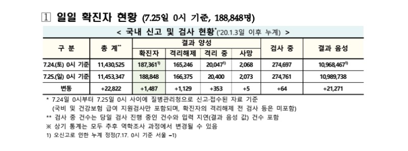 보건·의료 | 코로나19 국내 확진환자 총 188848명 및 격리해제 166375명·사망 2073명, 7월 25일 0시 기준 1487명 추가 확인