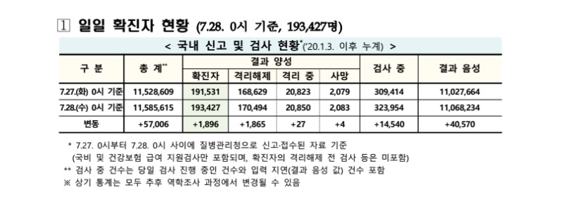 보건·의료 | 코로나19 국내 확진환자 총 193427명 및 격리해제 170494명·사망 2083명, 7월 28일 0시 기준 1896명 추가 확인