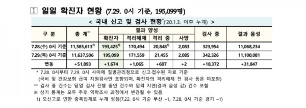 보건·의료 | 코로나19 국내 확진환자 총 195099명 및 격리해제 171559명·사망 2083명, 7월 29일 0시 기준 1674명 추가 확인