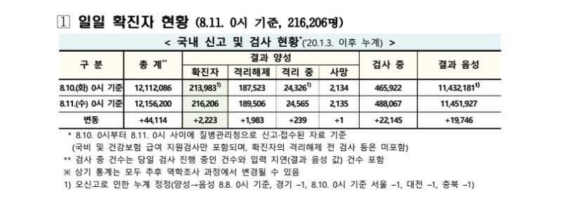 이에 따라 국내 코로나 19 확진자는 2021년 8월 11일(수) 0시 기준 216,206명으로 8월 10일(화) 0시 기준 213,983명에서 2,223명이 증가했으며 치료가 완료되어 검사 결과 음성으로 격리 해제된 자는 1,983명이 추가되며 총 189,506명, 사망은 8월 10일 대비 1명이 늘어나 2,135명, 나머지 24,565명은 격리 치료 중이다.