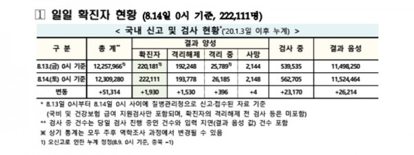 코로나19 국내 확진환자 총 222111명 및 격리해제 193778명·사망 2148명, 8월 14일 0시 기준 1930명 추가 확인