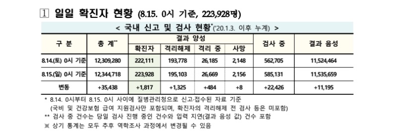 보건·의료 | 코로나19 국내 확진환자 총 223928명 및 격리해제 195103명·사망 2156명, 8월 15일 0시 기준 1817명 추가 확인