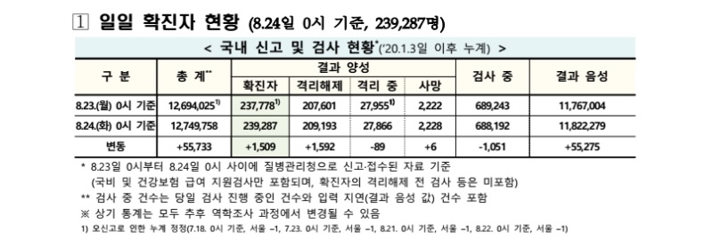 보건·의료 | 코로나19 국내 확진환자 총 239287명 및 격리해제 209193명·사망 2228명, 8월 24일 0시 기준 1509명 추가 확인