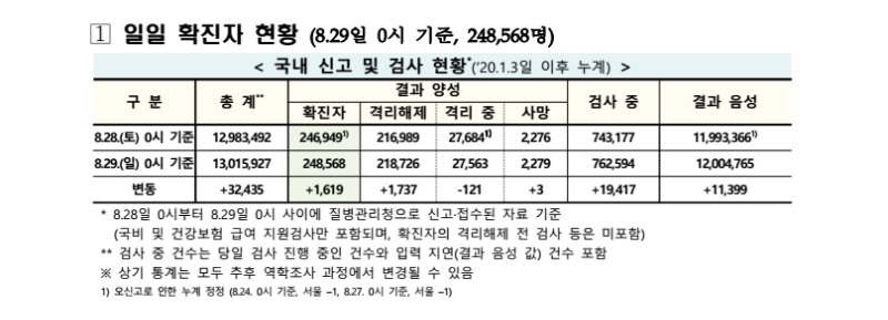 보건·의료 | 코로나19 국내 확진환자 총 248568명 및 격리해제 218726명·사망 2279명, 8월 29일 0시 기준 1619명 추가 확인