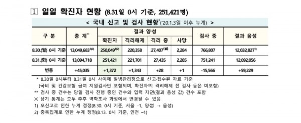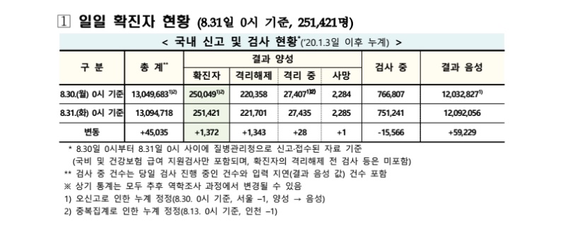 이에 따라 국내 코로나 19 확진자는 2021년 8월 31일(화) 0시 기준 251,421명으로 8월 30일(월) 0시 기준 250,049명에서 1,372명이 증가했으며 치료가 완료되어 검사 결과 음성으로 격리 해제된 자는 1,343명이 추가되며 총 221,701명, 사망은 8월 30일 대비 1명이 늘어나 2,285명, 나머지 27,435명은 격리 치료 중이다.