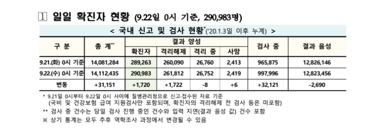 보건·의료 | 코로나19 국내 확진환자 총 290983명 및 격리해제 261812명·사망 2419명, 9월 22일 0시 기준 1720명 추가 확인