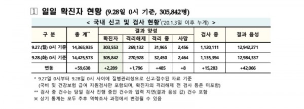 보건·의료 | 코로나19 국내 확진환자 총 305842명 및 격리해제 270928명·사망 2464명, 9월 28일 0시 기준 2289명 추가 확인