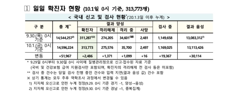 보건·의료 | 코로나19 국내 확진환자 총 313773명 및 격리해제 275576명·사망 2497명, 10월 1일 0시 기준 2486명 추가 확인