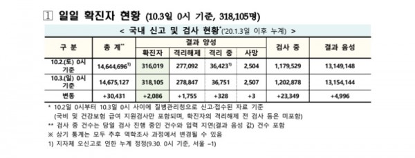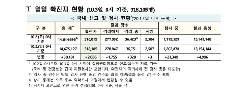 코로나19 국내 확진환자 총 318105명 및 격리해제 278847명·사망 2507명, 10월 3일 0시 기준 2086명 추가 확인