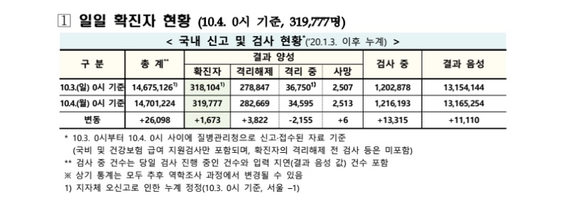보건·의료 | 코로나19 국내 확진환자 총 319777명 및 격리해제 282669명·사망 2513명, 10월 4일 0시 기준 1673명 추가 확인