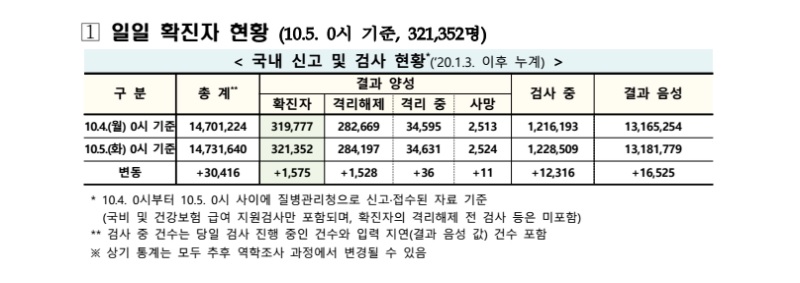 코로나19 국내 확진환자 총 321352명 및 격리해제 284197명·사망 2524명, 10월 5일 0시 기준 1575명 추가 확인