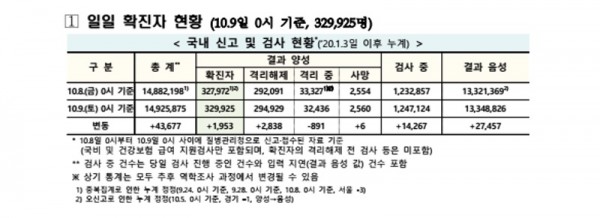 이에 따라 국내 코로나 19 확진자는 2021년 10월 9일(토) 0시 기준 329,925명으로 10월 8일(금) 0시 기준 327,972명에서 1,953명이 증가했으며 치료가 완료되어 검사 결과 음성으로 격리 해제된 자는 2,838명이 추가되며 총 294,929명, 사망은 10월 8일 대비 6명이 늘어나 2,560명, 나머지 32,436명은 격리 치료 중이다.