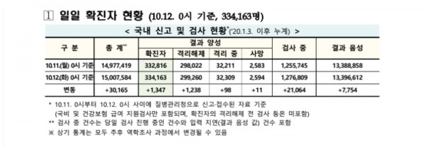 코로나19 국내 확진환자 총 334163명 및 격리해제 299260명·사망 2594명, 10월 12일 0시 기준 1347명 추가 확인