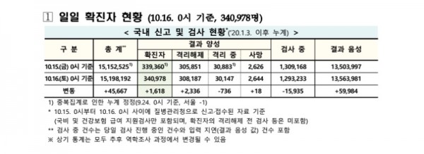 보건·의료 | 코로나19 국내 확진환자 총 340978명 및 격리해제 308187명·사망 2644명, 10월 16일 0시 기준 1618명 추가 확인