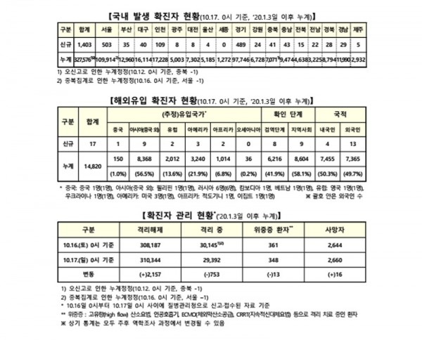 보건·의료 | 코로나19 국내 확진환자 총 342396명 및 격리해제 310344명·사망 2660명, 10월 17일 0시 기준 1420명 추가 확인
