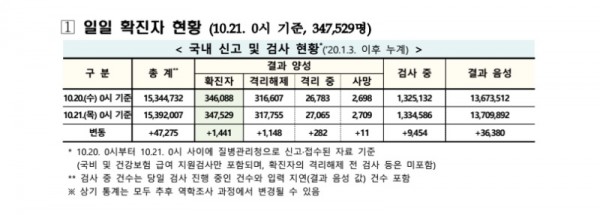 보건·의료 | 코로나19 국내 확진환자 총 347529명 및 격리해제 317755명·사망 2709명, 10월 21일 0시 기준 1441명 추가 확인