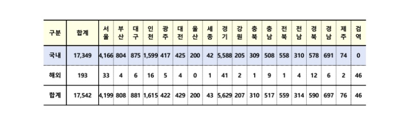 지역별로 살펴보면 2022년 1월 29일(토) 0시 기준 신규 17,542명으로 서울 4199, 경기 5629, 인천 1615, 부산 808, 대구 881, 광주 422, 대전 429, 울산 200, 세종 43, 강원 207, 충북 310, 충남 517, 전북 559, 전남 314, 경북 590, 경남 697, 제주 76, 검역 193명이다. 이 중 해외유입은 193명(서울 33, 경기 41, 인천 16, 부산 4, 대구 6, 광주 5, 대전 4, 울산 0, 세종 1, 강원 2, 충북 1, 충남 9, 전북 1, 전남 4, 경북 12, 경남 6, 제주 2, 검역 46), 지역발생은 17,349명(서울 4166, 경기 5588, 인천 1599, 부산 804, 대구 875, 광주 417, 대전 425, 울산 200, 세종 42, 강원 205, 충북 309, 충남 508, 전북 558, 전남 310, 경북 578, 경남 691, 제주 74)이 확인되며 전 세계적으로 코로나19가 빠르게 확산되는 가운데 해외유입에 따른 검역에서 확진자는 줄었으며 최근에는 코로나19 예방접종이 진행되는 가운데 지역 사회 감염이 증가 추세다.
