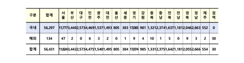 코로나바이러스감염증-19(코로나19, COVID-19)는 최근 수도권을 비롯하여 전국적인 감염 확산세로 1차와 2차 유행을 넘어 3차 대유행을 이어 발생 1년을 넘어서고 4차 대유행에 들어선 가운데 2022년 2월 13일(일) 0시 기준 국내 누적 확진자 135만 명을 넘어섰다. 오늘은 나흘 연속 50000명 대인 56,431명을 기록했다.