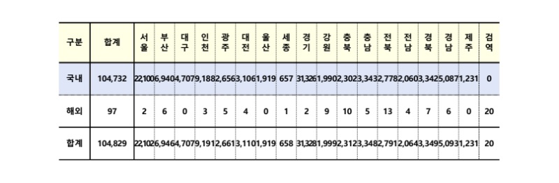 질병관리청 중앙방역대책본부는 2022년 2월 19일(토) 0시 부터 2월 20일(일) 0시까지 확진자 104,829명이 추가로 확인되었다고 밝혔다.