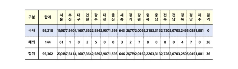 지역별로 살펴보면 2022년 2월 21일(월) 0시 기준 신규 95,362명으로 서울 20018, 경기 26779, 인천 7364, 부산 7541, 대구 4160, 광주 2589, 대전 2907, 울산 1593, 세종 646, 강원 2016, 충북 2226, 충남 3313, 전북 2728, 전남 2070, 경북 3250, 경남 5045, 제주 1081, 검역 144명이다. 이 중 해외유입은 144명(서울 61, 경기 2, 인천 2, 부산 1, 대구 0, 광주 5, 대전 0, 울산 0, 세종 3, 강원 7, 충북 8, 충남 0, 전북 8, 전남 0, 경북 4, 경남 7, 제주 0, 검역 36), 지역발생은 95,218명(서울 19957, 경기 26777, 인천 7362, 부산 7540, 대구 4160, 광주 2584, 대전 2907, 울산 1593, 세종 643, 강원 2009, 충북 2218, 충남 3313, 전북 2720, 전남 2070, 경북 3246, 경남 5038, 제주 1081)이 확인되며 전 세계적으로 코로나19가 빠르게 확산되는 가운데 해외유입에 따른 검역에서 확진자는 줄었으며 최근에는 코로나19 예방접종이 진행되는 가운데 지역 사회 감염이 증가 추세다.