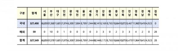 지역별로 살펴보면 2022년 3월 10일(목) 0시 기준 신규 327,549명으로 서울 66859, 경기 88144, 인천 21975, 부산 31578, 대구 11601, 광주 6300, 대전 7884, 울산 8789, 세종 1944, 강원 8172, 충북 8765, 충남 10666, 전북 10075, 전남 8470, 경북 11964, 경남 19412, 제주 4923, 검역 59명이다. 이 중 해외유입은 59명(서울 0, 경기 3, 인천 1, 부산 10, 대구 0, 광주 0, 대전 0, 울산 0, 세종 0, 강원 3, 충북 0, 충남 2, 전북 3, 전남 3, 경북 4, 경남 2, 제주 0, 검역 28), 지역발생은 327,490명(서울 66859, 경기 88141, 인천 21974, 부산 31568, 대구 11601, 광주 6300, 대전 7884, 울산 8789, 세종 1944, 강원 8169, 충북 8765, 충남 10664, 전북 10072, 전남 8647 경북 11960, 경남 19410, 제주 4923)이 확인되며 전 세계적으로 코로나19가 빠르게 확산되는 가운데 해외유입에 따른 검역에서 확진자는 줄었으며 최근에는 코로나19 예방접종이 진행되는 가운데 지역 사회 감염이 증가 추세다.