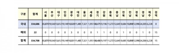 지역별로 살펴보면 2022년 3월 20일(일) 0시 기준 신규 334,708명으로 서울 65870, 경기 88480, 인천 19149, 부산 19543, 대구 13612, 광주 10031, 대전 11485, 울산 7321, 세종 1951, 강원 9197, 충북 11272, 충남 12645, 전북 9685, 전남 10898, 경북 12990, 경남 24336, 제주 6228, 검역 22명이다. 이 중 해외유입은 22명(서울 0, 경기 0, 인천 0, 부산 0, 대구 0, 광주 3, 대전 0, 울산 0, 세종 0, 강원 1, 충북 0, 충남 0, 전북 1, 전남 0, 경북 0, 경남 1, 제주 0, 검역 15), 지역발생은 334,686명(서울 65870, 경기 88479, 인천 19149, 부산 19543, 대구 13612, 광주 10028, 대전 11485, 울산 7321, 세종 19510, 강원 9196, 충북 11272, 충남 12645, 전북 9684, 전남 10898, 경북 12990, 경남 24335, 제주 6228)이 확인되며 전 세계적으로 코로나19가 빠르게 확산되는 가운데 해외유입에 따른 검역에서 확진자는 줄었으며 최근에는 코로나19 예방접종이 진행되는 가운데 지역 사회 감염이 증가 추세다.