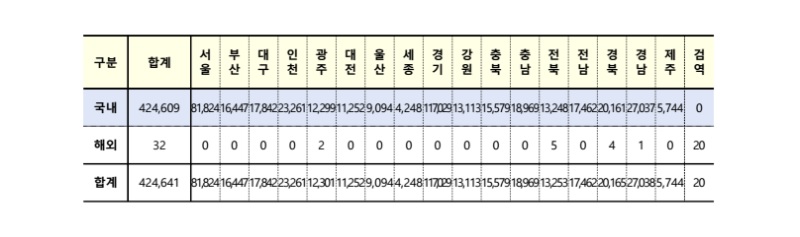 지역별로 살펴보면 2022년 3월 30일(수) 0시 기준 신규 424,641명으로 서울 81824, 경기 117029, 인천 23261, 부산 16447, 대구 17842, 광주 12301, 대전 11252, 울산 9094, 세종 4248, 강원 13113, 충북 15579, 충남 18969, 전북 13253, 전남 17462, 경북 20165, 경남 27038, 제주 5744, 검역 32명이다. 이 중 해외유입은 32명(서울 0, 경기 0, 인천 0, 부산 0, 대구 0, 광주 2, 대전 0, 울산 0, 세종 0, 강원 0, 충북 0, 충남 0, 전북 5, 전남 0, 경북 4, 경남 1, 제주 0, 검역 20), 지역발생은 424,609명(서울 81824, 경기 117029, 인천 23261, 부산 16447, 대구 17842, 광주 12299, 대전 11252, 울산 9094, 세종 4248, 강원 13113, 충북 15579, 충남 18969, 전북 13248, 전남 17462, 경북 20161, 경남 27037, 제주 5744)이 확인되며 전 세계적으로 코로나19가 빠르게 확산되는 가운데 해외유입에 따른 검역에서 확진자는 줄었으며 최근에는 코로나19 예방접종이 진행되는 가운데 지역 사회 감염이 증가 추세다.