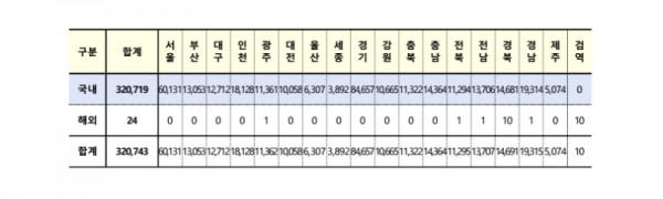 지역별로 살펴보면 2022년 3월 31일(목) 0시 기준 신규 320,743명으로 서울 60131, 경기 84657, 인천 18128, 부산 13053, 대구 12712, 광주 11362, 대전 10058, 울산 6307, 세종 3892, 강원 10665, 충북 11322, 충남 14364, 전북 11295, 전남 13707, 경북 14691, 경남 19315, 제주 5074, 검역 24명이다. 이 중 해외유입은 24명(서울 0, 경기 0, 인천 0, 부산 0, 대구 0, 광주 1, 대전 0, 울산 0, 세종 0, 강원 0, 충북 0, 충남 0, 전북 1, 전남 1, 경북 10, 경남 1, 제주 0, 검역 10), 지역발생은 320,719명(서울 60131, 경기 84657, 인천 18128, 부산 13053, 대구 12712, 광주 11361, 대전 10058, 울산 6307, 세종 3892, 강원 10665, 충북 11322, 충남 14364, 전북 11294, 전남 13706, 경북 14681, 경남 19314, 제주 5074)이 확인되며 전 세계적으로 코로나19가 빠르게 확산되는 가운데 해외유입에 따른 검역에서 확진자는 줄었으며 최근에는 코로나19 예방접종이 진행되는 가운데 지역 사회 감염이 증가 추세다.