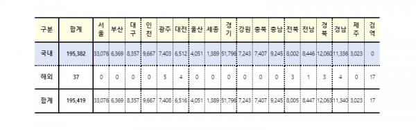 지역별로 살펴보면 2022년 4월 13일(수) 0시 기준 신규 195,419명으로 서울 33076, 경기 51796, 인천 9667, 부산 6369, 대구 8357, 광주 7408, 대전 6516, 울산 4051, 세종 1389, 강원 7243, 충북 7407, 충남 9245, 전북 8005, 전남 8447, 경북 12063, 경남 11340, 제주 3023, 검역 37명이다. 이 중 해외유입은 37명(서울 0, 경기 0, 인천 0, 부산 0, 대구 0, 광주 5, 대전 4, 울산 0, 세종 0, 강원 0, 충북 0, 충남 0, 전북 3, 전남 1, 경북 3, 경남 4, 제주 0, 검역 17), 지역발생은 195,382명(서울 33076, 경기 51796, 인천 9667, 부산 6369, 대구 8357, 광주 7403, 대전 6512, 울산 4051, 세종 1389, 강원 7243, 충북 7407, 충남 9245, 전북 8002, 전남 8446, 경북 12060, 경남 11336, 제주 3023)이 확인되며 전 세계적으로 코로나19가 빠르게 확산되는 가운데 해외유입에 따른 검역에서 확진자는 줄었으며 최근에는 코로나19 예방접종이 진행되는 가운데 지역 사회 감염이 증가 추세다.