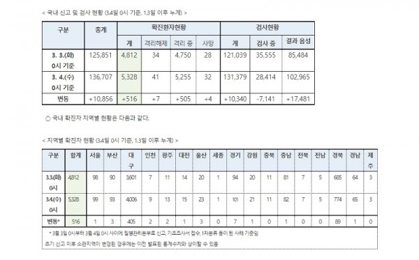 코로나바이러스감염증-19, 코로나 19, 코로나19, 신종 코로나, 신종 코로나바이러스, 감염증, 우한 폐렴, COVID-19, 보건복지부, 질병관리본부, 중앙방역대책본부, 국내, 한국, 확진자, 확진환자, 3월 4일, 수, 수요일, 0시, 자정, 516명 추가, 대구·경북지역, 대구, 영남권, 서울, 경기, 경남, 광주, 총 5328명, 지역사회 감염, 위기경보 단계, 심각, 격상, 사망 32명, 격리 해제 41명