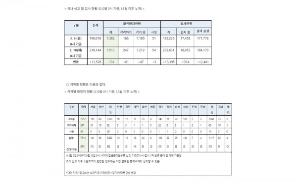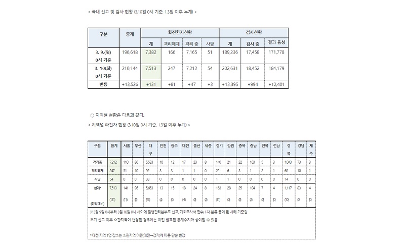 코로나바이러스감염증-19, 코로나 19, 코로나19, 신종 코로나, 신종 코로나바이러스, 감염증, 우한 폐렴, COVID-19, 보건복지부, 질병관리본부, 중앙방역대책본부, 국내, 한국, 확진자, 확진환자, 3월 10일, 화, 화요일, 0시, 자정, 131명 추가, 대구·경북지역, 대구, 영남권, 서울, 경기, 경남, 광주, 총 7513명, 지역사회 감염, 위기경보 단계, 심각, 격상, 사망 54명, 격리 해제 247명