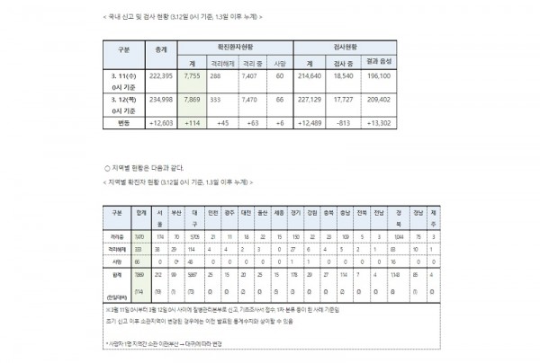 3월 11일(수) 0시 기준 7,755명에서 3월 12일 0시 기준 확진자 114명이 추가되며 7,869명으로 늘어났다. 지난 8일과 9일 200명대에 10일 100명대로 감소세가 이어졌으나 11일 서울과 지방 등지에서 집단 감염이 확인됨에 따라 확진자 수가 증가했는데 12일에는 다시 약간의 감소 추세가 이어졌다.