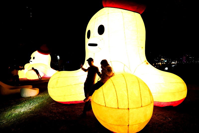 4미터 크기의 대형 에어벌룬과 2미터 크기의 인형으로 구성된 LG유플러스 대표 캐릭터 ‘무너’ 포토존에서 시민들이 자유롭게 기념 사진을 촬영하며 ‘서울라이트 한강 빛섬축제’를 즐기고 있다.
