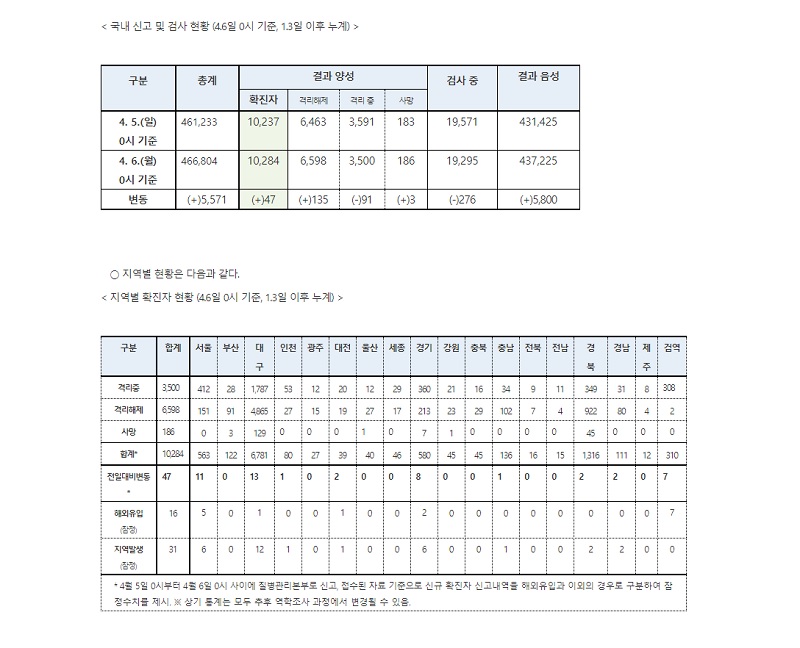 코로나바이러스감염증-19, 코로나 19, 코로나19, 신종 코로나, 신종 코로나바이러스, 감염증, 우한 폐렴, COVID-19, 보건복지부, 질병관리본부, 중앙방역대책본부, 한국, 확진자, 확진환자, 4월 6일, 월, 월요일, 0시, 자정, 47명 추가, 대구·경북지역, 대구, 영남권, 서울, 경기, 경남, 광주, 총 10284명, 지역사회 감염, 위기경보 단계, 심각, 격상, 사망 186명, 격리 해제 6598명, WHO, 팬데믹, Pandeminc, 팬데믹 선언, 감염병 세계적 유행, 집단 감염, 사회적 거리 두기