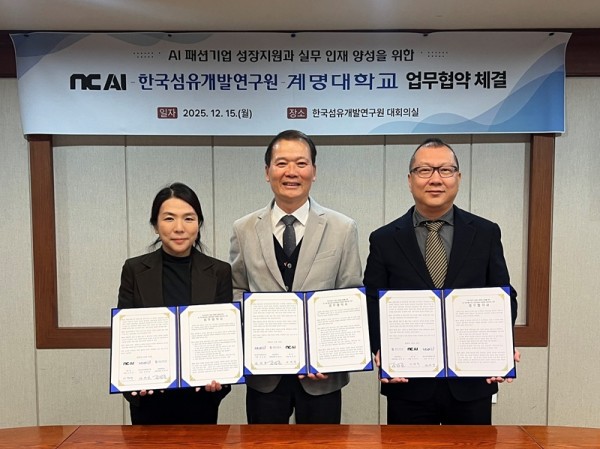 국대 AI 기업 NC AI가 한국섬유개발연구원, 계명대학교와 함께 ‘지속가능한 K-패션 생태계 강화를 위한 AI 기반 패션기업 성장 지원과 인재양성 협력기반 구축’을 위한 업무협약(MOU)을 체결했다고 16일 밝혔다. 협약식은 NC AI 임수진 CBO, 한국섬유개발연구원 김성만 원장, 계명대학교 김범준 산학부총장 등 주요 관계자들이 참석한 가운데 대구 한국섬유개발연구원에서 진행됐다.