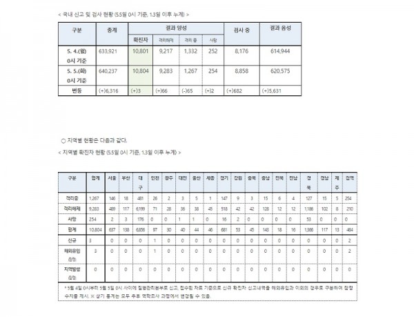코로나19 국내 확진환자 총 10804명 및 격리해제 9283명·사망 254명, 5월 5일 0시 기준 3명 추가 확인