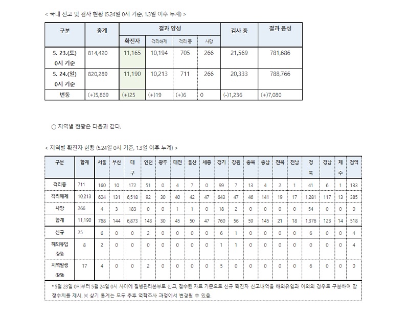 보건·의료 | 코로나19 국내 확진환자 총 11190명 및 격리해제 10213명·사망 266명, 5월 24일 0시 기준 25명 추가 확인
