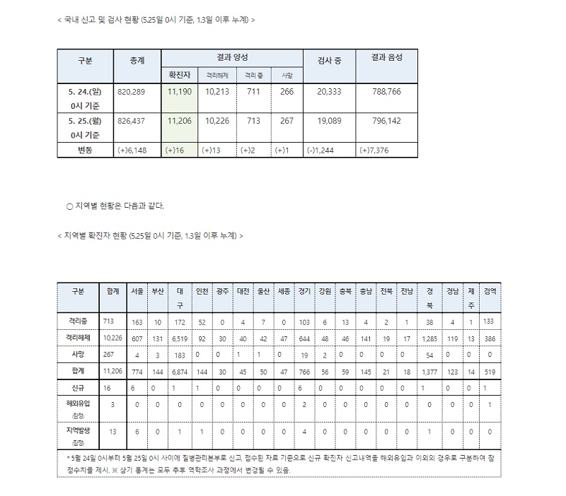 보건·의료 | 코로나19 국내 확진환자 총 11206명 및 격리해제 10226명·사망 267명, 5월 25일 0시 기준 16명 추가 확인