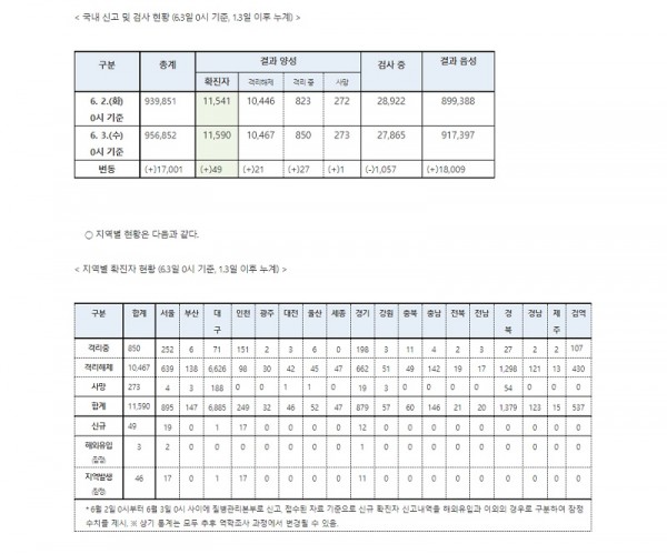 이에 따라 국내 코로나 19 확진자는 6월 3일(수) 0시 기준 11,590명으로 6월 2일(화) 0시 기준 11,541명에서 49명이 증가했으며 치료가 완료되어 검사 결과 음성으로 격리 해제된 자는 21명이 추가되며 총 10,467명, 사망은 6월 2일 대비 1명이 늘어나 273명, 나머지 850명은 격리 치료 중이다.