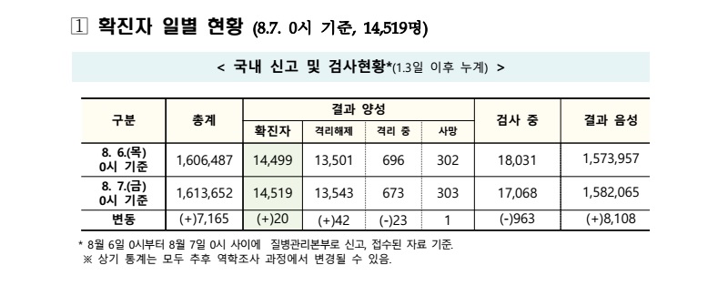 코로나19 국내 확진환자 총 14519명 및 격리해제 13543명·사망 303명, 8월 7일 0시 기준 20명 추가 확인