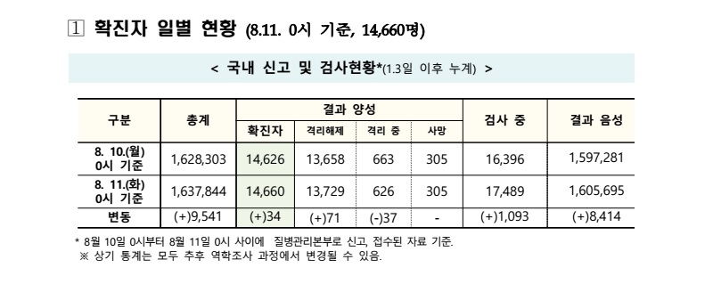보건·의료 | 코로나19 국내 확진환자 총 14660명 및 격리해제 13729명·사망 305명, 8월 11일 0시 기준 34명 추가 확인