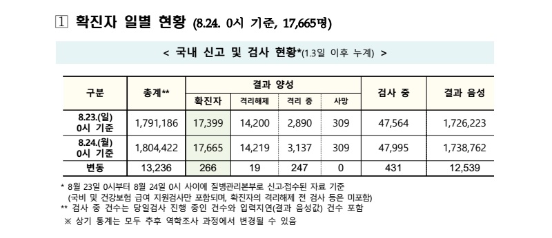 코로나19 국내 확진환자 총 17665명 및 격리해제 14219명·사망 309명, 8월 24일 0시 기준 266명 추가 확인