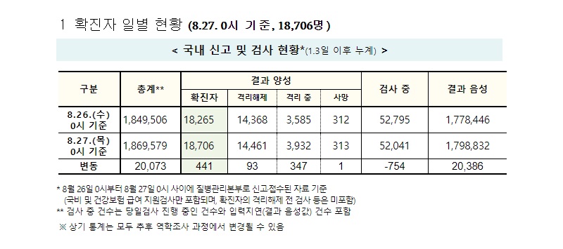이에 따라 국내 코로나 19 확진자는 8월 27일(목) 0시 기준 18,706명으로 8월 26일(수) 0시 기준 18,265명에서 441명이 증가했으며 치료가 완료되어 검사 결과 음성으로 격리 해제된 자는 93명이 추가되며 총 14,461명, 사망은 8월 26일 대비 1명이 늘어나 313명, 나머지 3,932명은 격리 치료 중이다.