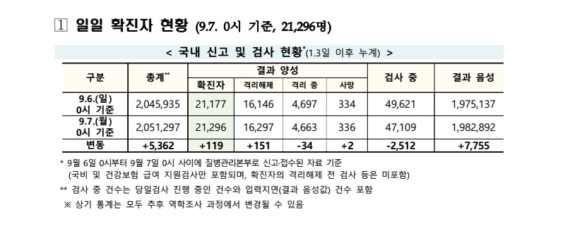코로나19 국내 확진환자 총 21296명 및 격리해제 16297명·사망 336명, 9월 7일 0시 기준 119명 추가 확인
