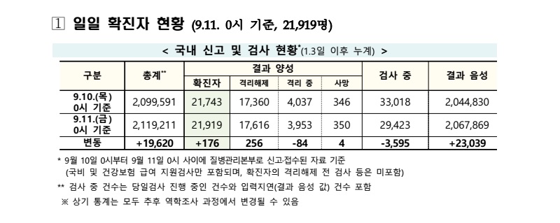코로나19 국내 확진환자 총 21919명 및 격리해제 17616명·사망 350명, 9월 11일 0시 기준 176명 추가 확인