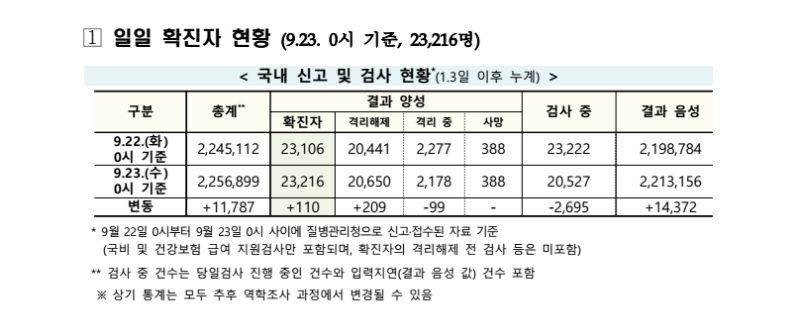 이에 따라 국내 코로나 19 확진자는 9월 23일(수) 0시 기준 23,216명으로 9월 22일(화) 0시 기준 23,106명에서 110명이 증가했으며 치료가 완료되어 검사 결과 음성으로 격리 해제된 자는 209명이 추가되며 총 20,650명, 사망은 9월 22일 대비 0명이 늘어나 388명, 나머지 2,178명은 격리 치료 중이다.