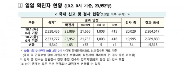 코로나19 국내 확진환자 총 23952명 및 격리해제 21733명·사망 416명, 10월 2일 0시 기준 63명 추가 확인